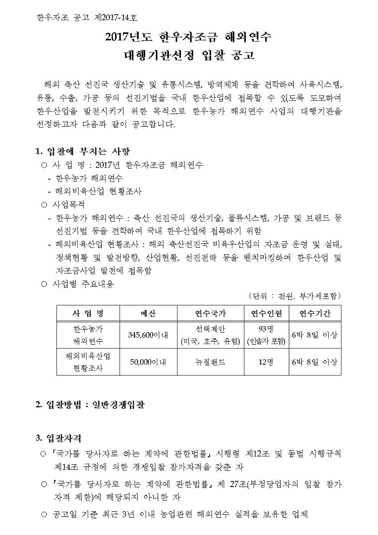2017년도 축산자조금(우유,한우,한돈) 성과분석 연구용역기관 선정공고_긴급