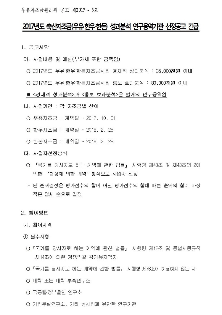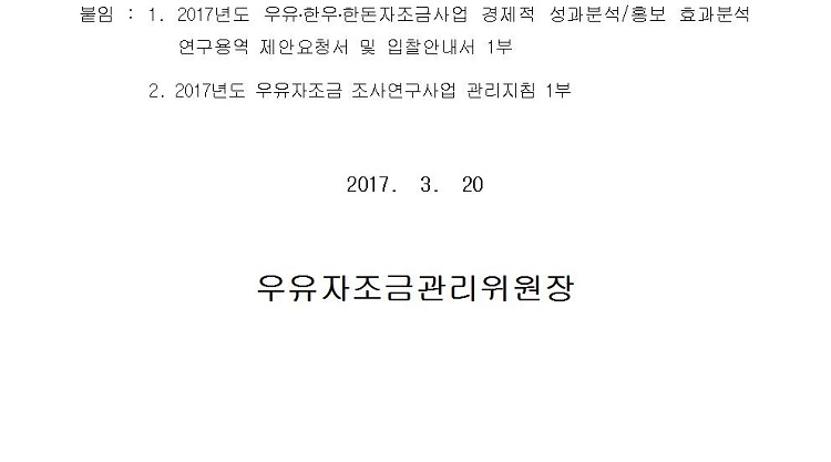 2017년도 한우자조금 해외연수 대행기관선정 입찰 공고