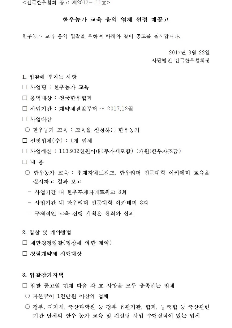 공고-한우농가교육용역업체선정재입찰(201703).hwp