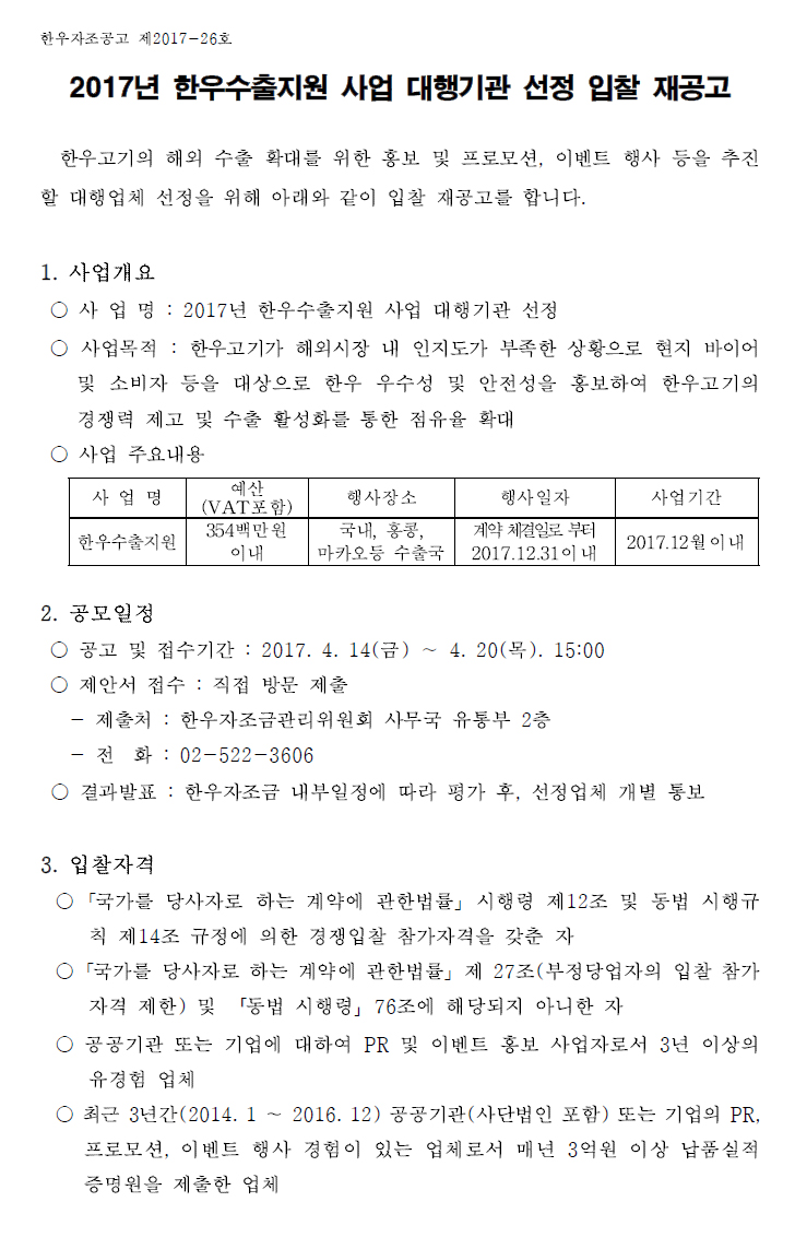 한우수출지원사업 대행업체 선정 입찰 재공고문.hwp