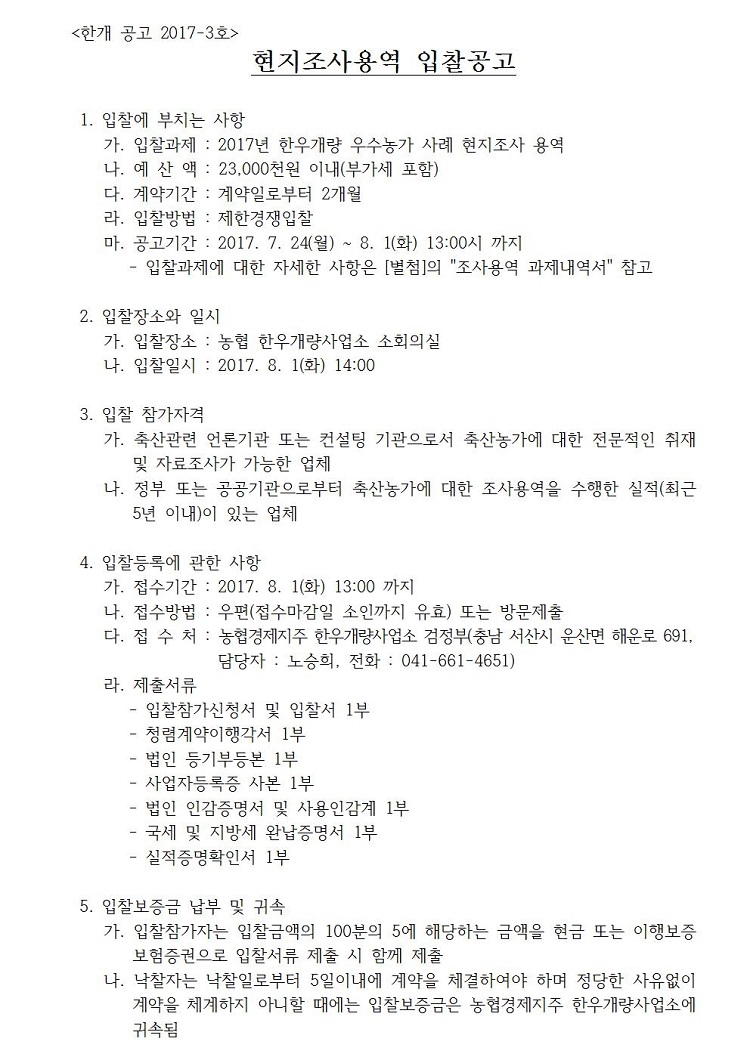 2017년 1차 한우자조금 조사연구 특정과제 제안공모 재공고
