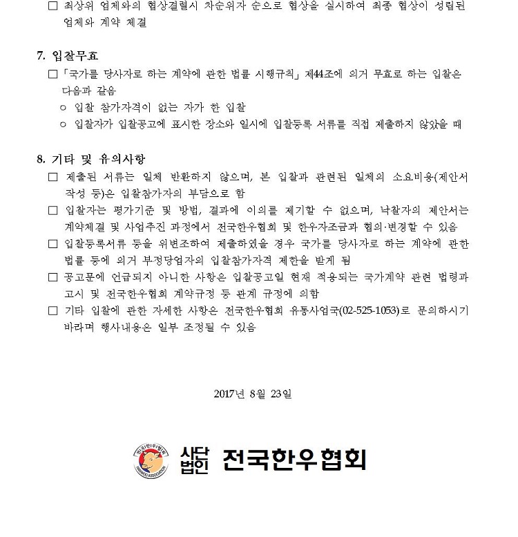2017년 하반기 한우 소비촉진 홍보용품 제작 재입찰 공고