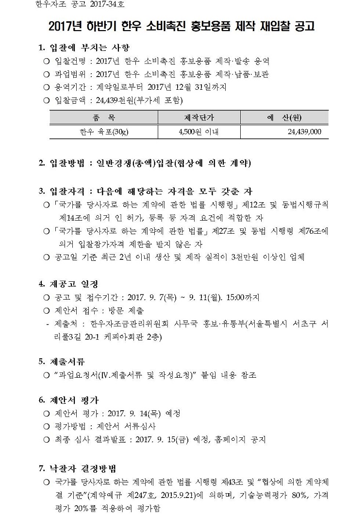 2017년 하반기 한우 소비촉진 홍보용품 제작 재입찰 공고문.hwp