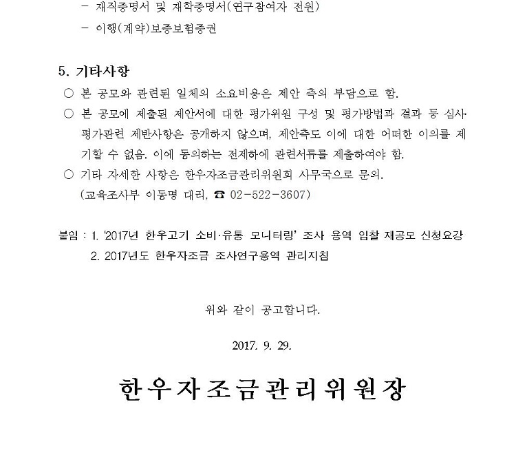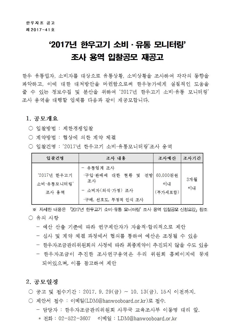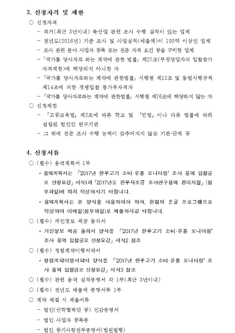 ‘2017년 한우고기 소비·유통 모니터링’ 조사 용역 입찰 재공모 신청요강.hwp