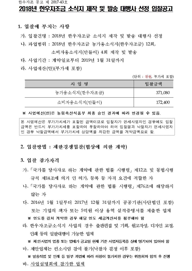 2018년 한우자조금 소식지 제작 및 발송 대행사 선정 공고문.hwp