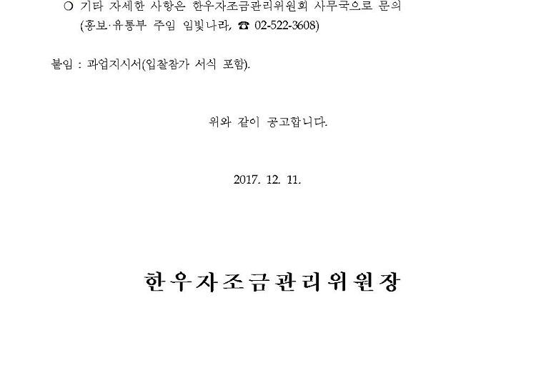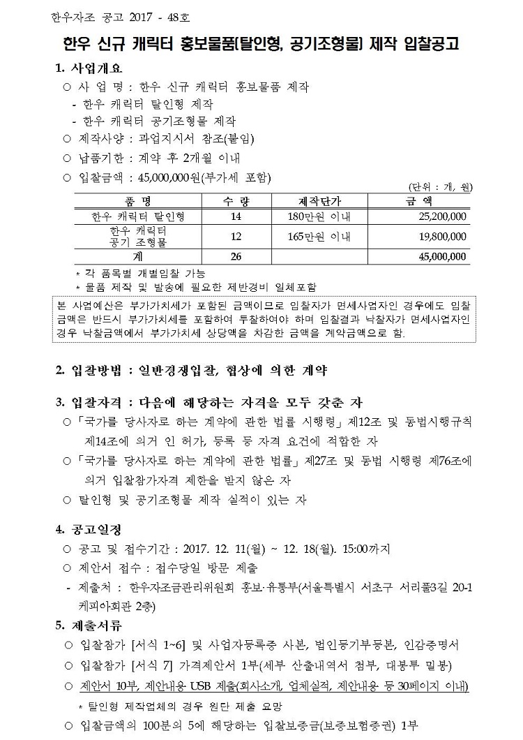 171211 한우 신규 캐릭터 홍보물품(탈인형, 공기조형물) 제작 입찰공고.hwp