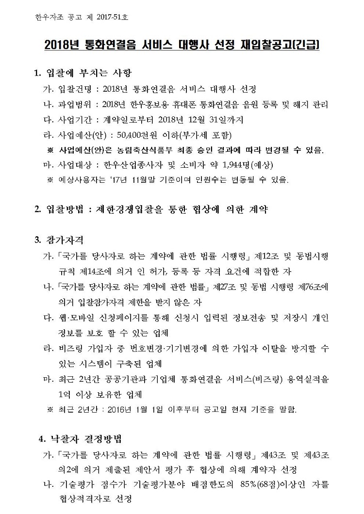 2018년 한우자조금 통화연결음 서비스 대행사 선정 재공고문(긴급).hwp