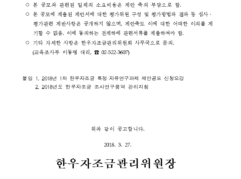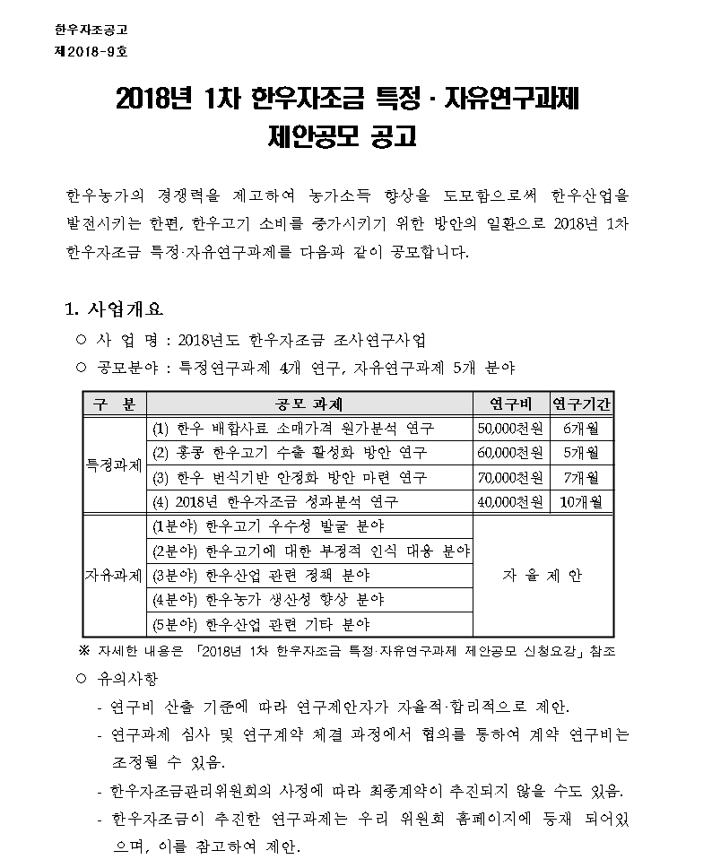 2018년 1차 한우자조금 특정·자유연구과제 제안공모 공고.hwp