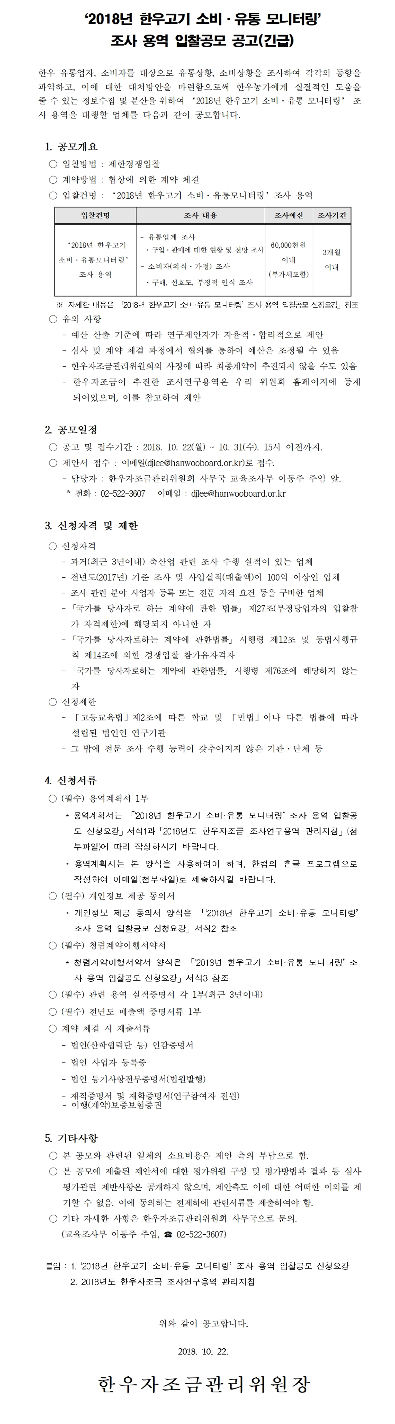 2018년 하반기 한우 소비홍보물 제작 입찰공고