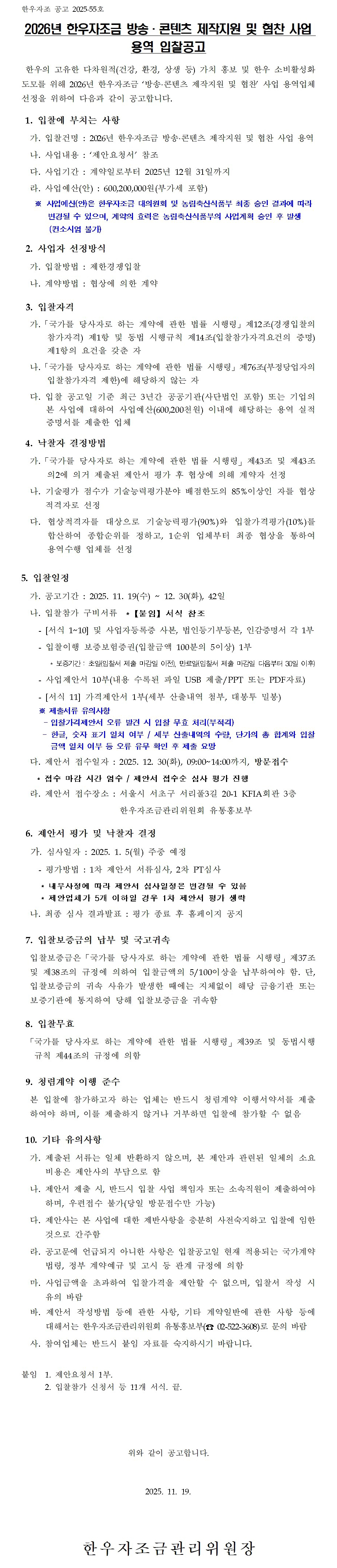 (공고문) 2026년 한우자조금 방송콘텐츠 제작지원 및 협찬 사업 용역 입찰공고.hwp
