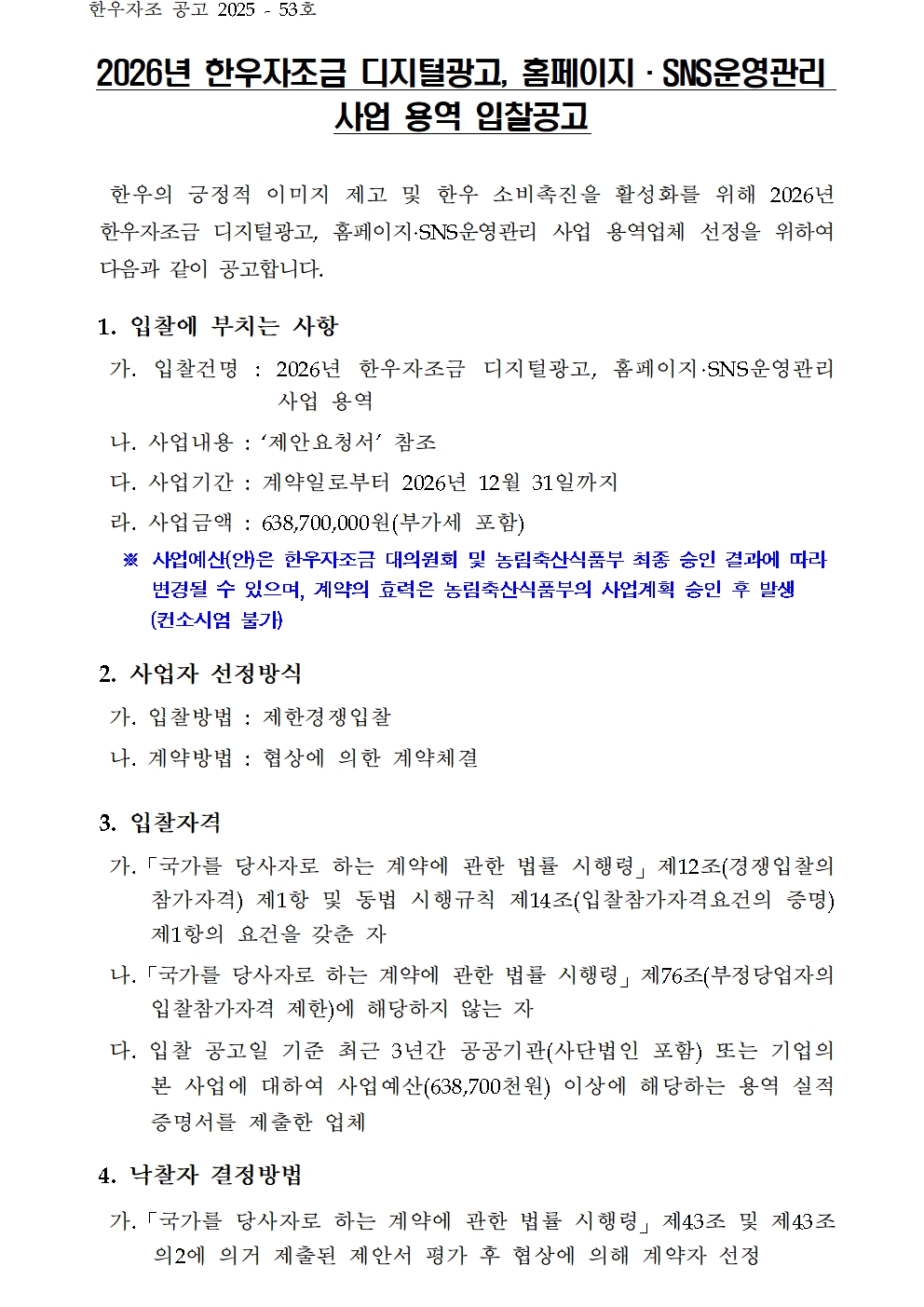(공고문) 2026년 한우자조금 디지털광고, 홈페이지·SNS운영관리 사업 용역 입찰공고.hwp