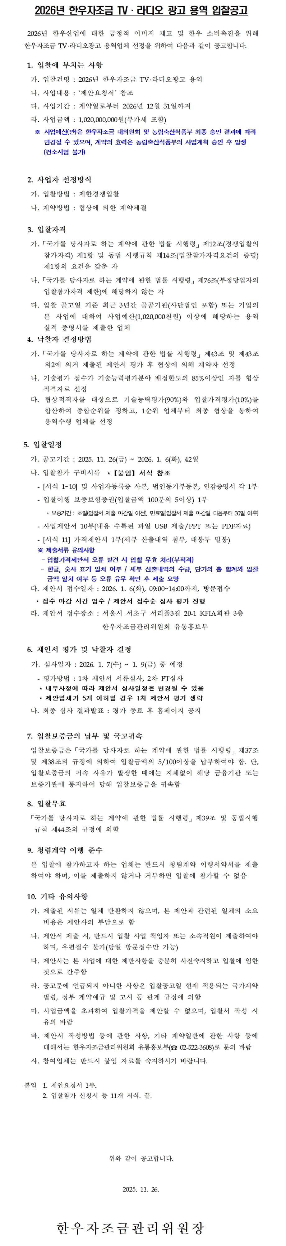 (공고문) 2026년 한우자조금 TV·라디오광고 용역 입찰공고.hwp