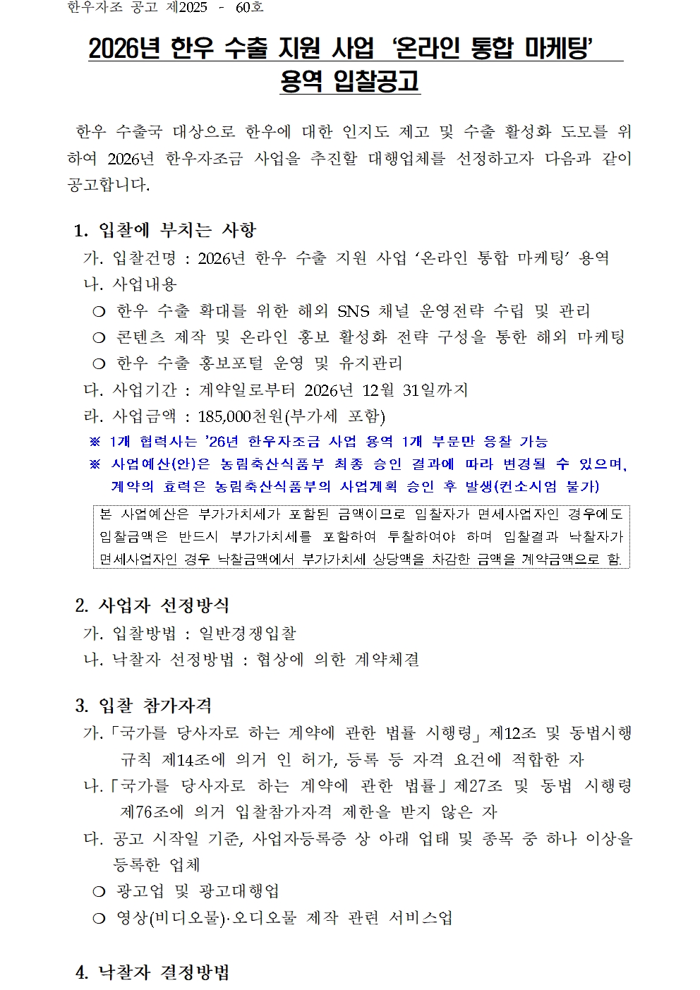 2026년 한우 수출 지원 사업‘온라인 통합 마케팅’ 용역 입찰공고.hwp