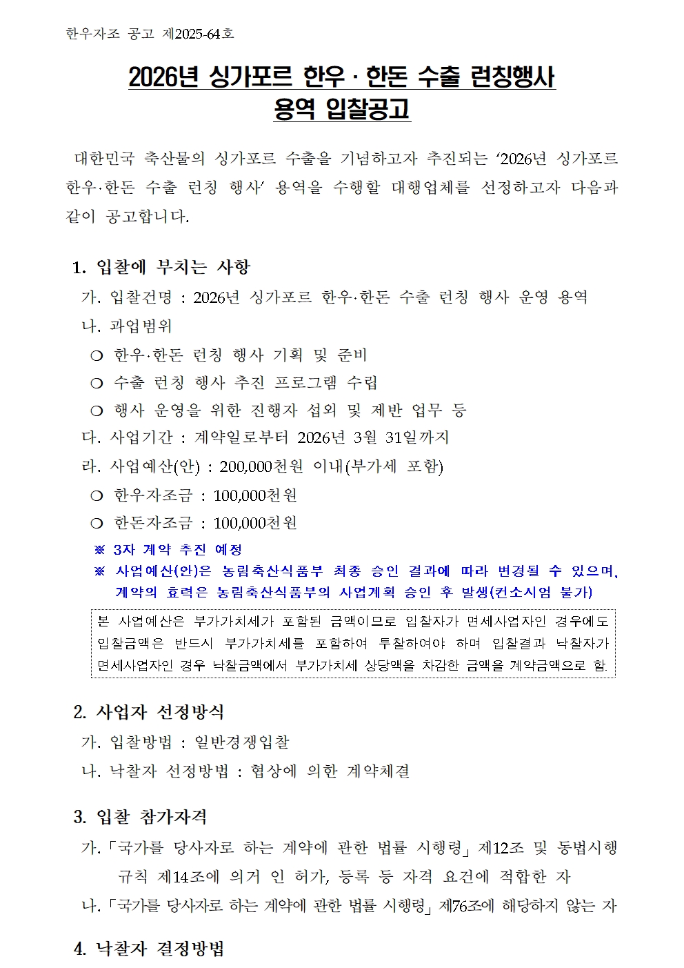 2026년 싱가포르 한우·한돈 수출 런칭행사 용역 입찰공고.hwp