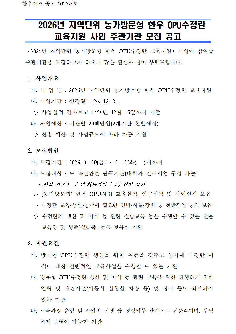 2026년 ‘지역단위 농가방문형 OPU수정란 생산지원‘ 사업 수행기관 공고문.pdf