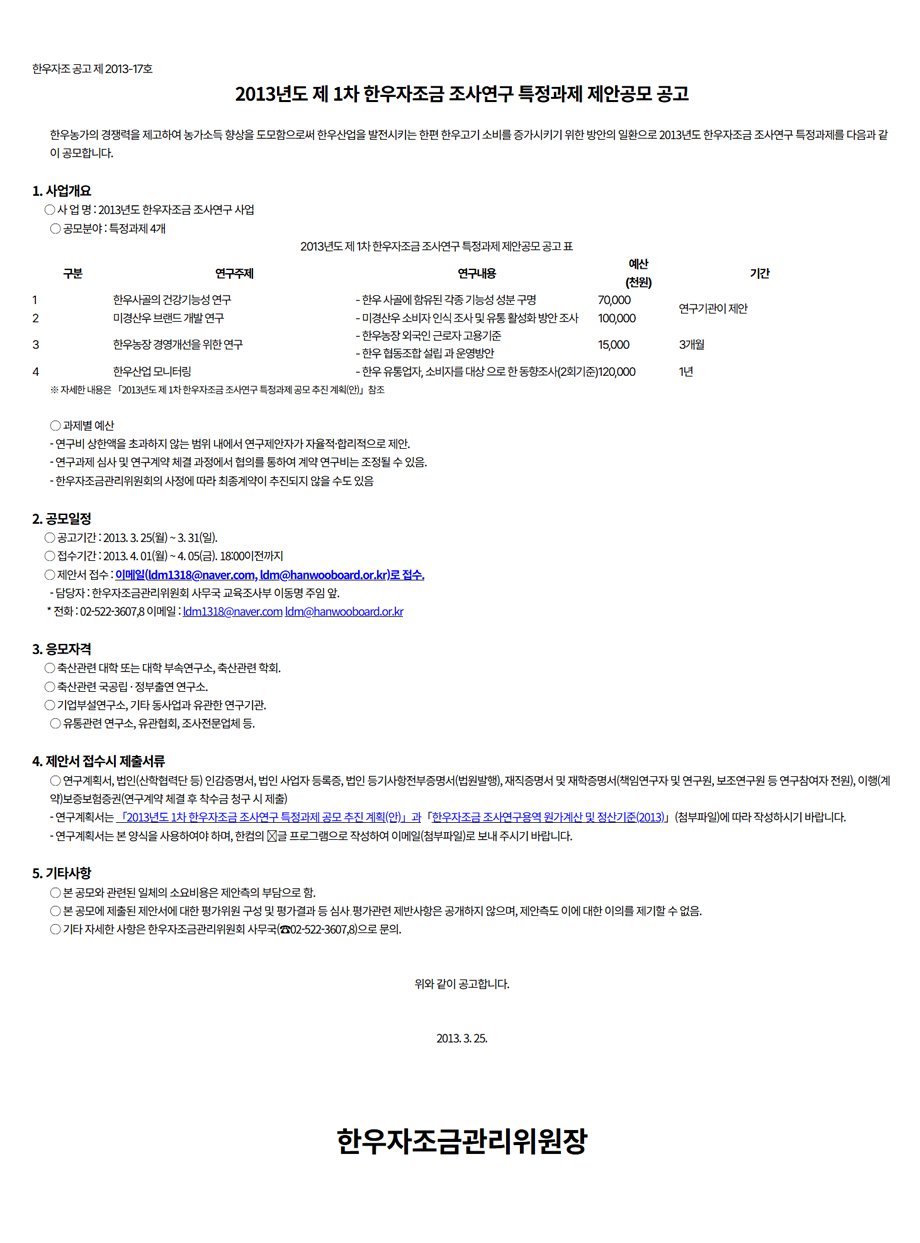 20130315-2013년 1차 한우자조금 조사연구 특정과제 공모 추진계획(안).hwp