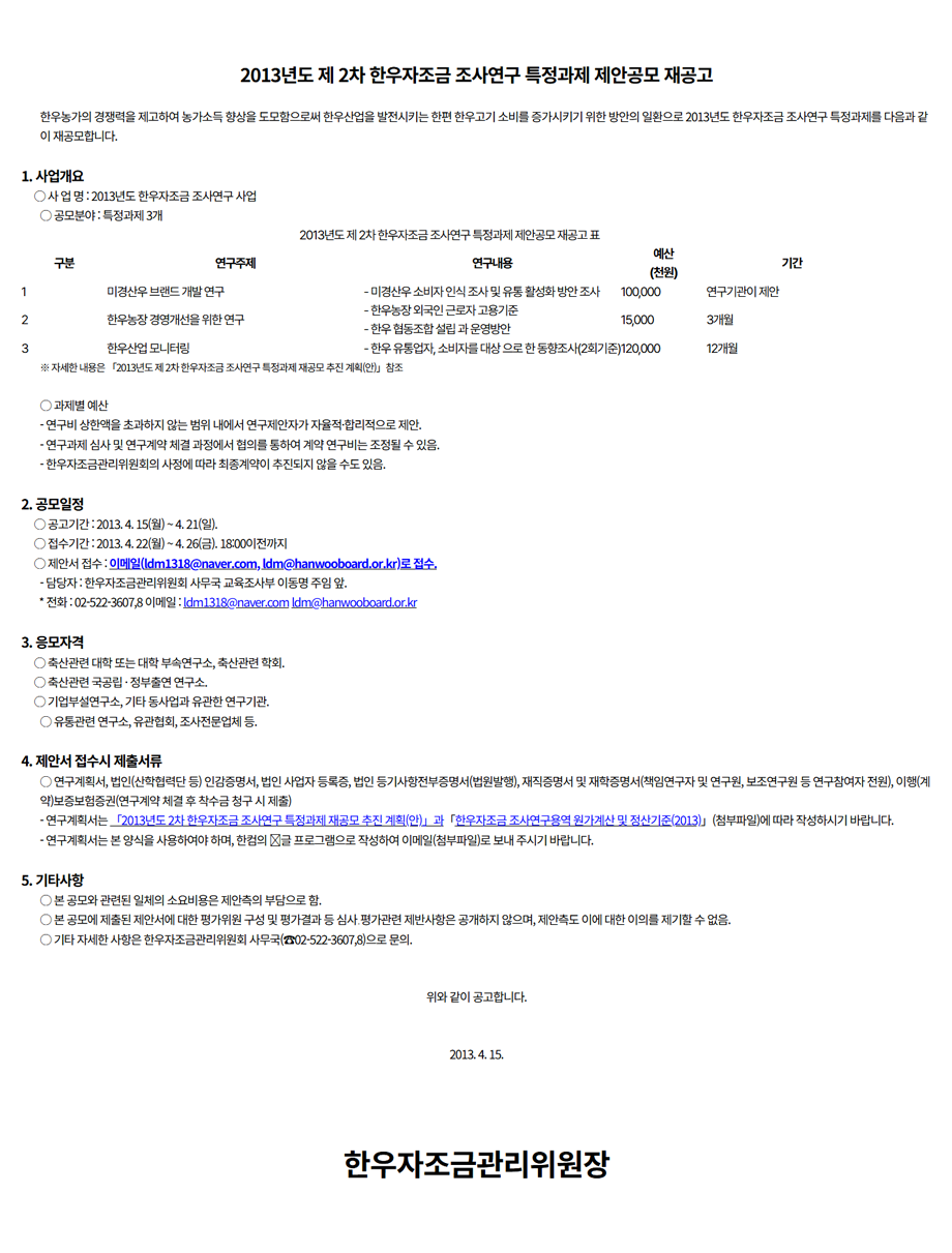 [연구용역 입찰공고] 2013년도 제 1차 한우자조금 조사연구 특정과제 제안공모 공고