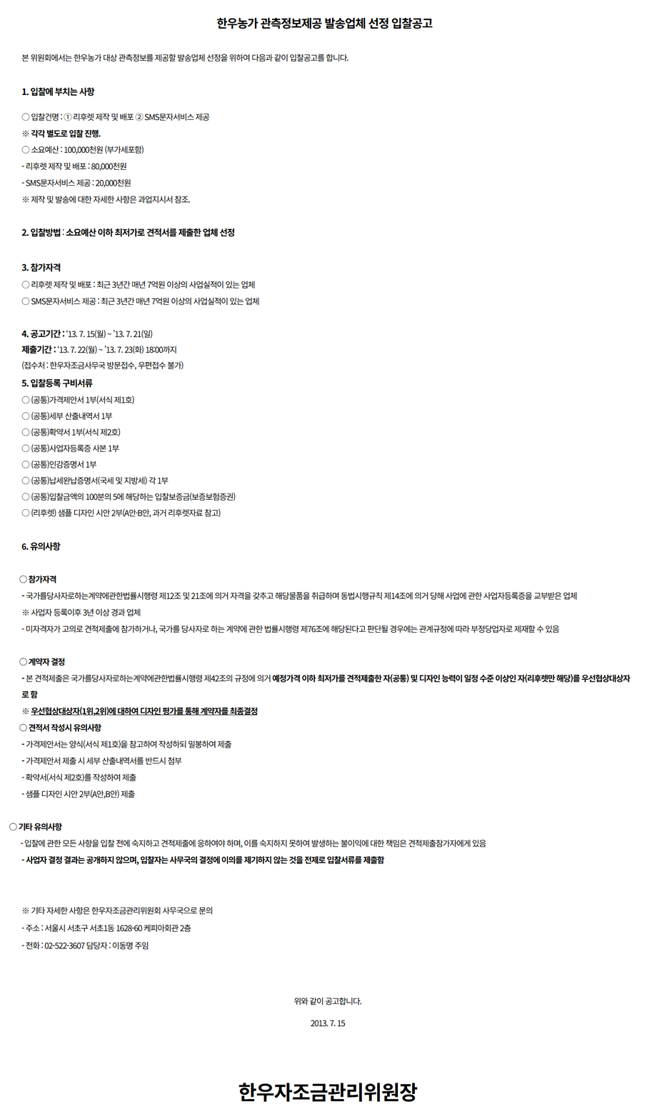 [연구용역 입찰공고] 2013년 한우산업 모니터링 제안공모 공고