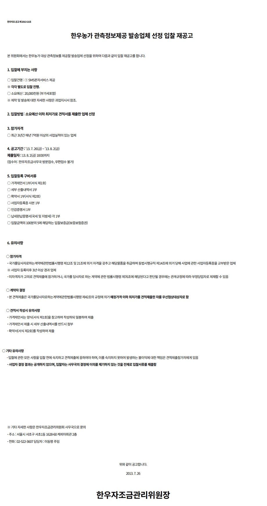 [연구용역 입찰재공고] 2013년도 한우산업 모니터링 제안공모 재공고(2차)