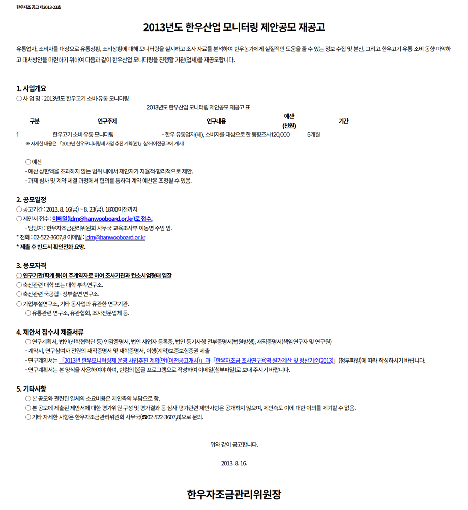 [연구용역 입찰재공고] 2013년도 한우산업 모니터링 제안공모 재공고(2차)