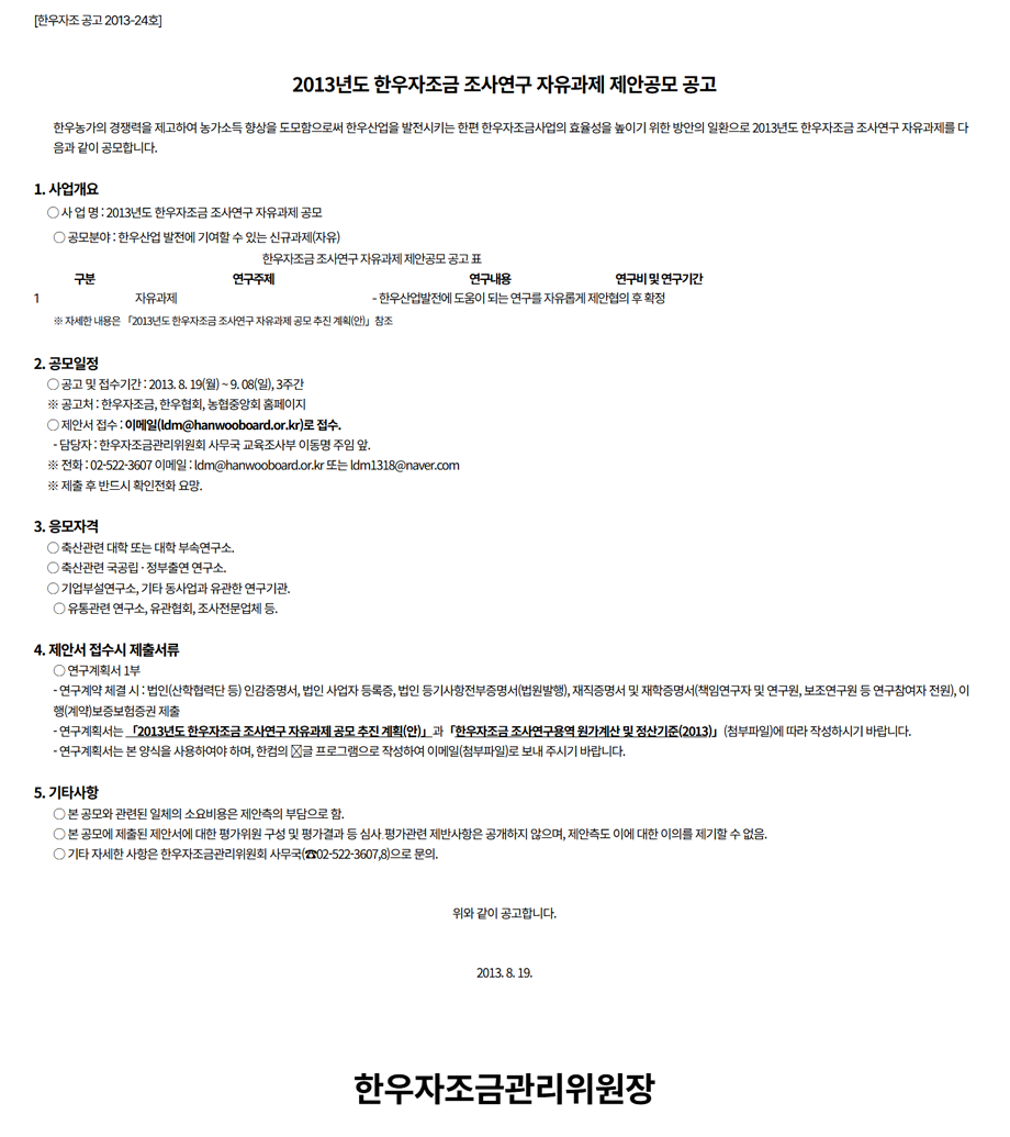 20130812- 2013년 한우자조금 조사연구 자유과제 공모 추진계획(안).hwp