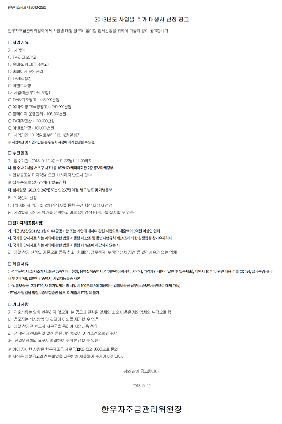 2013 사업별 추가 대행사 선정 설명자료(13.9.12).hwp