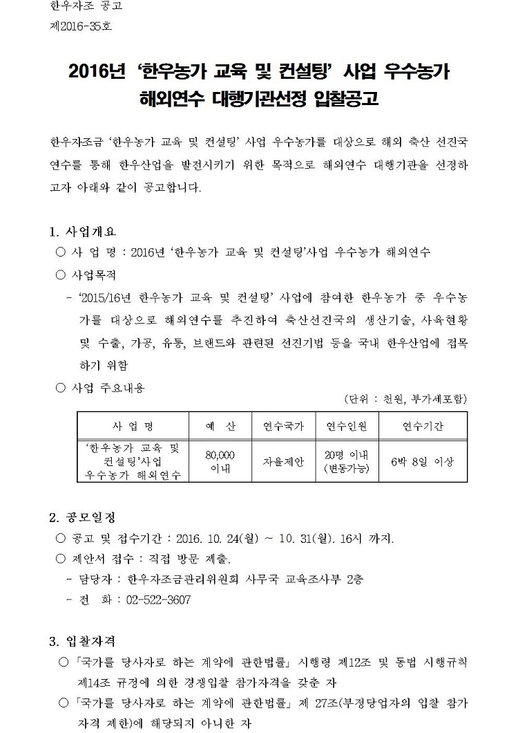 2016년‘한우농가 교육 및 컨설팅’사업 우수농가 해외연수 대행기관선정 입찰공고