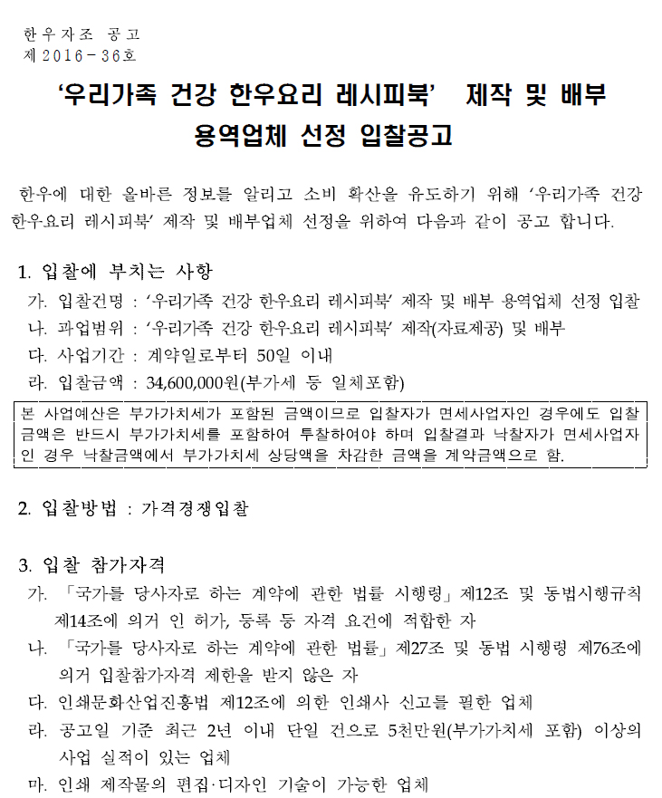 한우자조공고_제2016-36호_레시피북제작_공고문.hwp