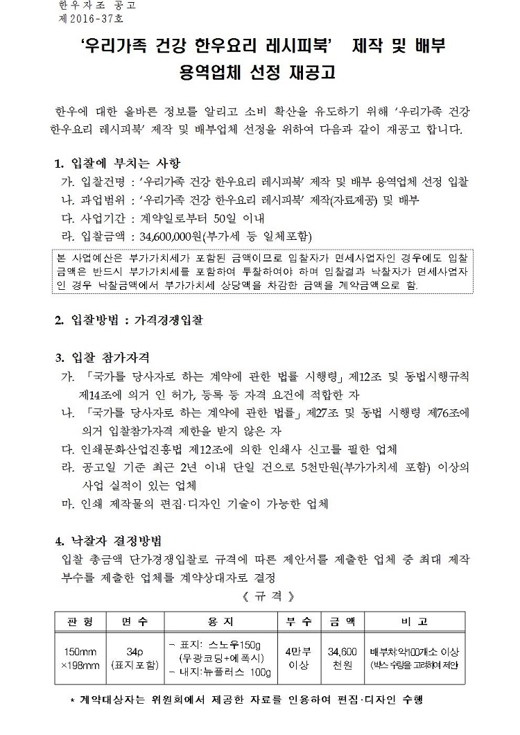 ‘우리가족 건강 한우요리 레시피북’ 제작 및 배부 용역업체 선정 입찰공고
