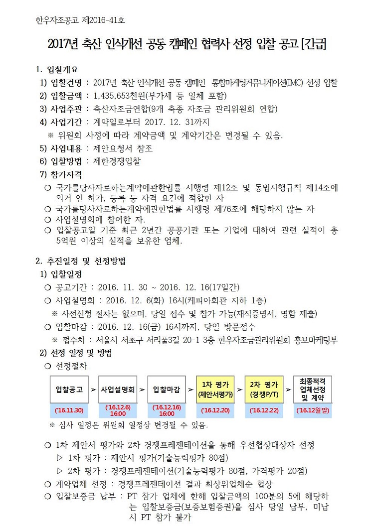 2017년 한우자조금 사업별 홍보 협력사 선정 입찰공고(긴급)