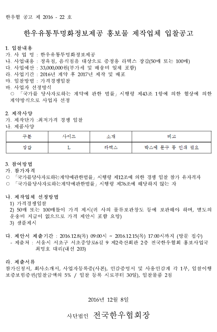 한우 유통투명화 정보제공 홍보물 제작업체 입찰공고