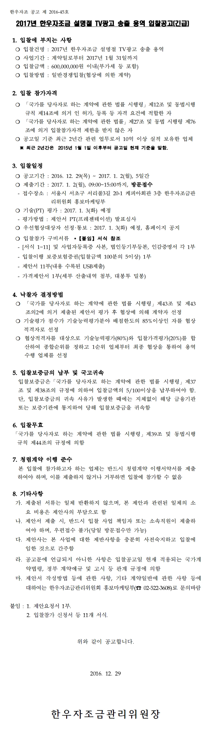 2017년 한우자조금 설명절 TV광고 송출 용역 입찰공고(긴급).hwp