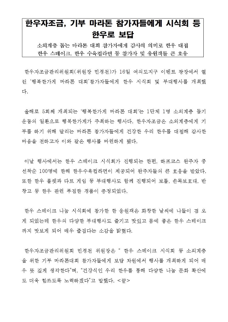 [보도자료]한우자조금, 기부 마라톤 참가자들에게 시식회 등 한우로 보답.hwp