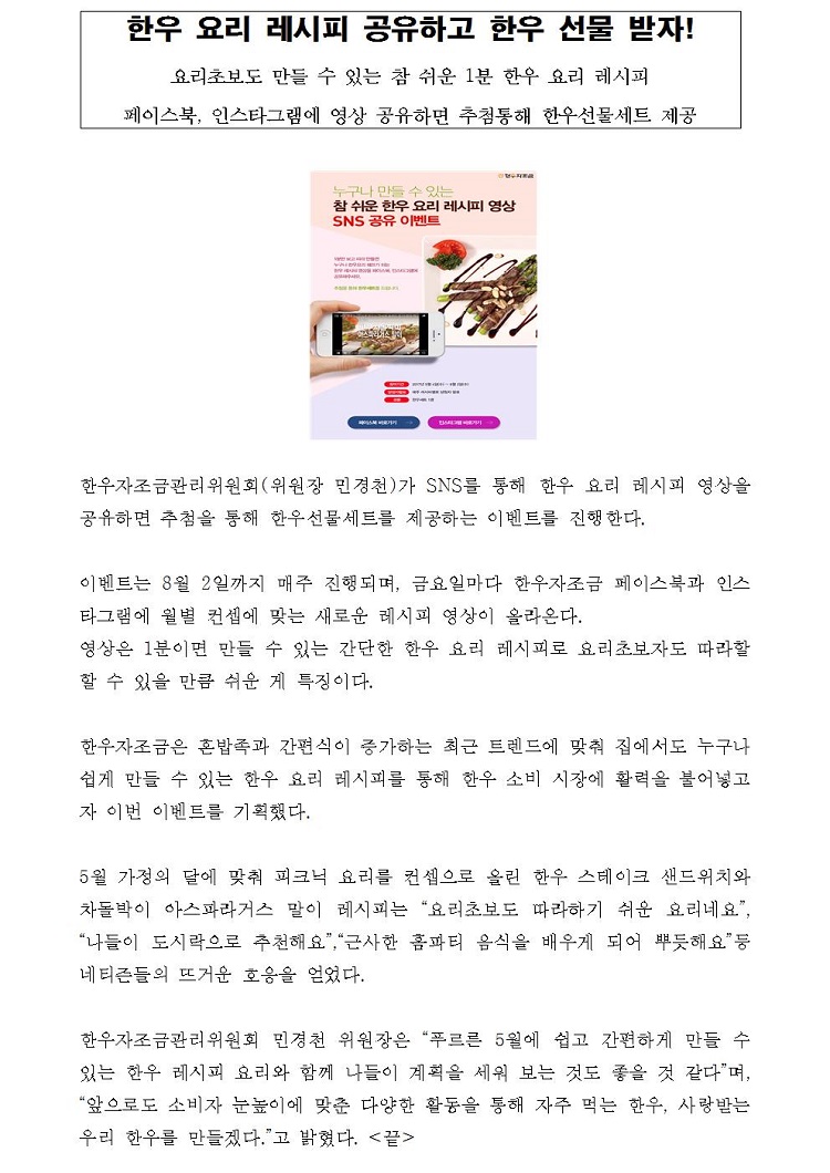 [보도자료]한우 요리 레시피 공유하고 한우 받자!.hwp