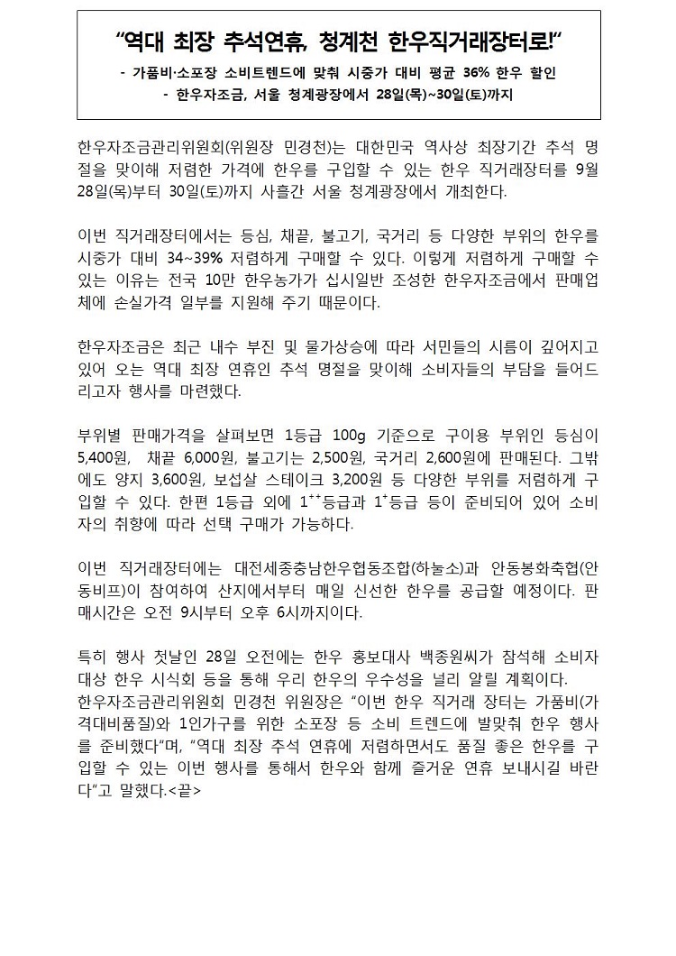 [보도자료]역대 최장 추석연휴, 청계천 한우직거래장터로!.hwp