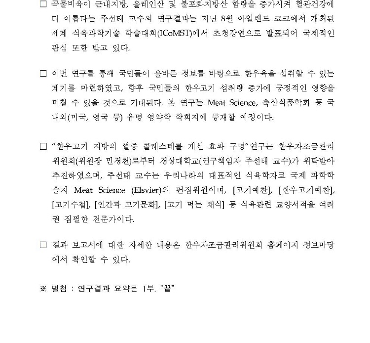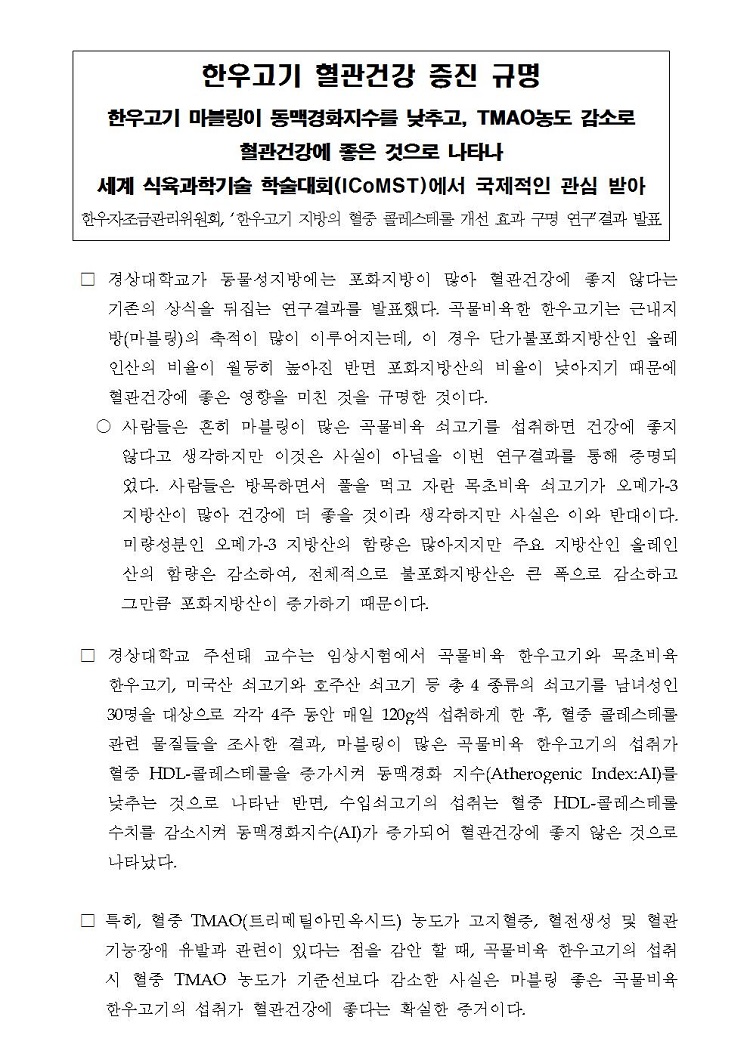 [보도자료]한우자조금, ‘한우고기 지방의 혈중 콜레스테롤 개선 효과 구명 연구’결과 발표.hwp