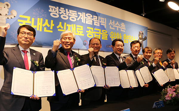 31일, 서울 중구 한식문화관에서 열린 ‘평창올림픽 선수촌 국산 식재료 공급 협약식’에서 행사 관계자들이 협약서를 들고 기념촬영을 하고 있다. 한우자조금은 이날 협약을 통해 세계인의 축제인 평창 동계올림픽에 6억원 상당의 한우고기를 지원하고, 우리 농축산물과 함께 한식의 브랜드 가치와 인지도를 높이는데 앞장서기로 약속했다. (좌로부터 최성재 신세계푸드 대표, 엄경익 횡성축협 조합장, 김태환 축산경제대표, 김영록 농림축산식품부 장관, 민경천 한우자조금위원장, 하태식 한돈자조금위원장, 김대근 한식진흥원 사무총장, 박홍진 현대그린푸드 대표)