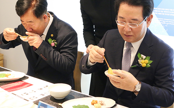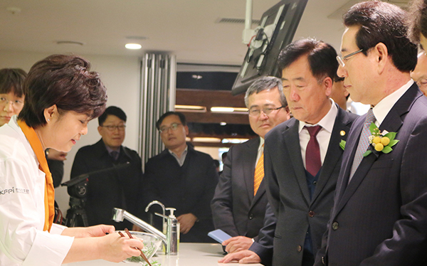 31일, 서울 중구 한식문화관에서 열린 ‘평창올림픽 선수촌 국산 식재료 공급 협약식’에서 농림부 김영록 장관이 관계자로부터 평창동계올림픽에 지원되는 요리에 대한 설명을 듣고 있다. 한편 이날 한우, 한돈자조금을 비롯한 각 기관은 평창동계올림픽 선수촌에 국산 식재료 지원을 약속하고 우리 농축산물과 함께 한식의 브랜드 가치와 인지도를 높이는데 앞장서기로 약속했다.