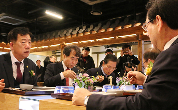 31일, 서울 중구 한식문화관에서 열린 ‘평창올림픽 선수촌 국산 식재료 공급 협약식’에서 한우자조금 민경천 위원장이 농림부 김영록 장관에게 평창올림픽 선수촌에 지원되는 한우를 소개하며 한우 요리를 함께 맛보고 있다. 한편 한우자조금은 이날 협약을 통해 세계인의 축제인 평창 동계올림픽에 6억원 상당의 한우고기를 지원하고, 우리 농축산물과 함께 한식의 브랜드 가치와 인지도를 높이는데 앞장서기로 약속했다.