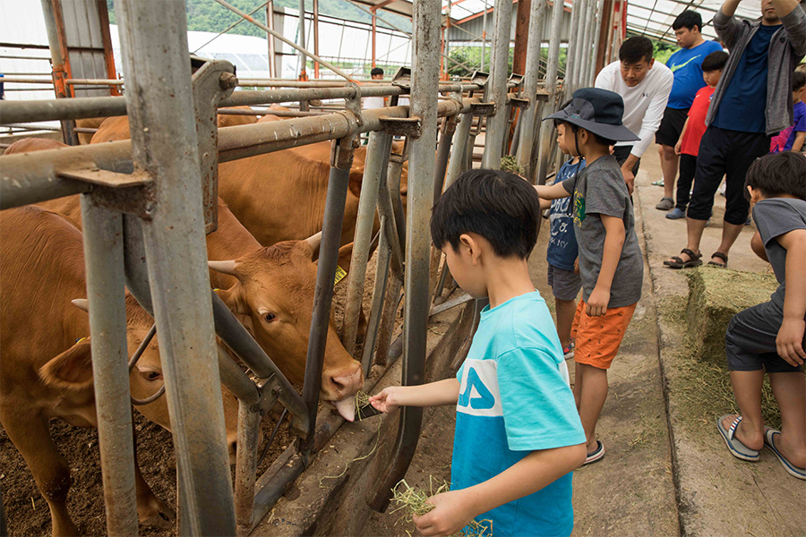 한우 공감 캠핑 페스티벌’ 에 참가한 어린이가 인근 한우농가에서 한우에게 직접 먹이를 주고
