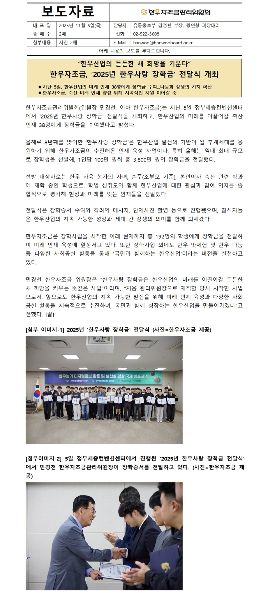 [한우자조금-보도자료] 한우자조금, ‘2025년 한우사랑 장학금’ 전달식 개최.hwp