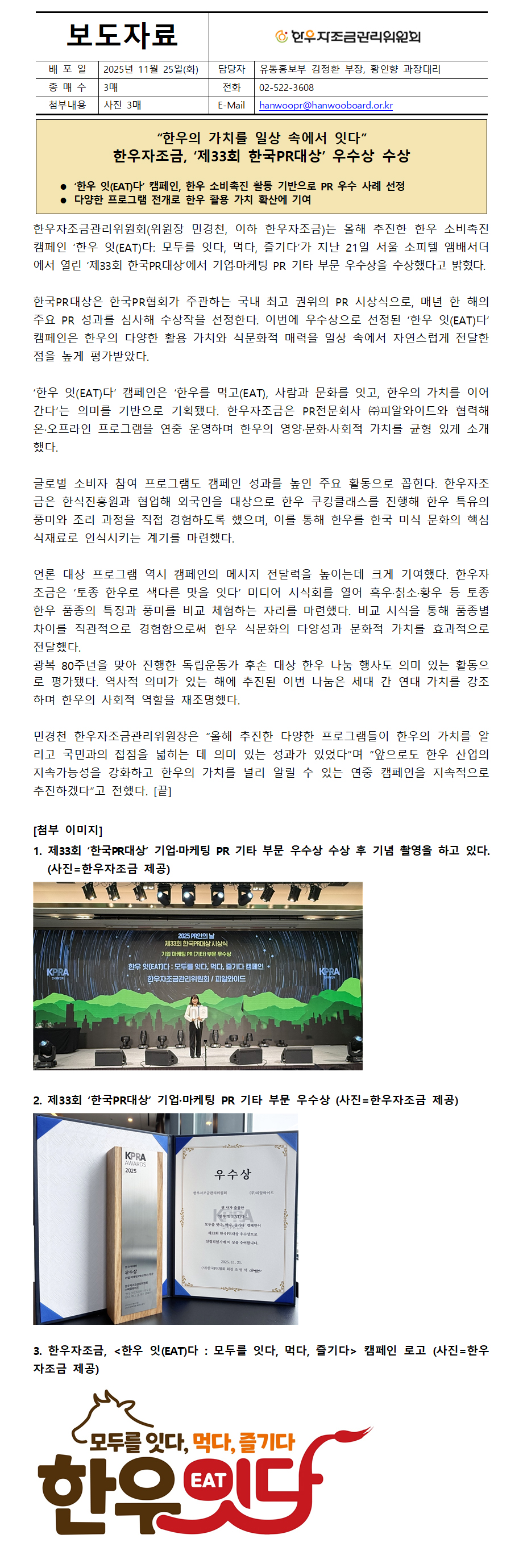 [한우자조금-보도자료] “한우의 가치를 일상 속에서 잇다” 한우자조금, ‘제33회 한국PR대상’ 우수상 수상.hwp