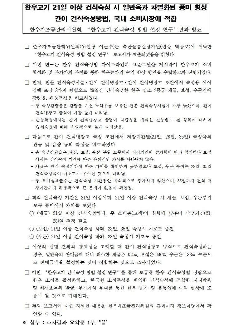 [보도자료] 한우자조금, ‘한우고기 건식숙성 방법 설정 연구’결과 발표.hwp