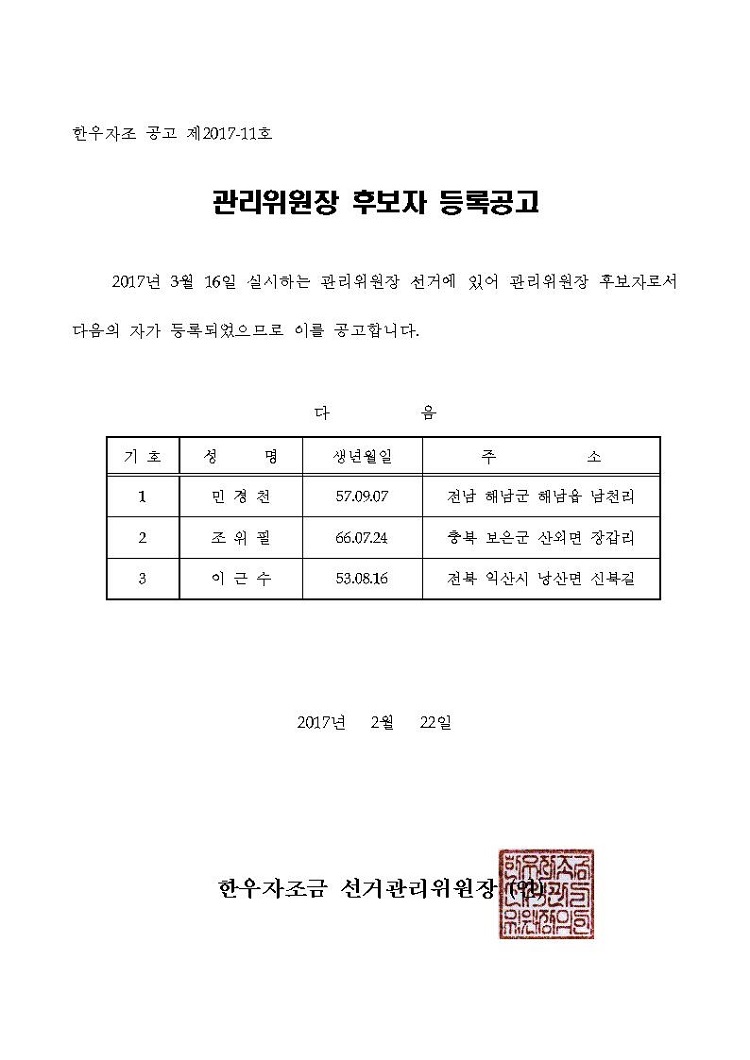 [공고] 관리위원장 후보자 등록공고