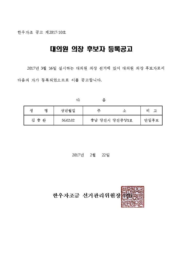 [공고] 대의원 의장 후보자 등록공고