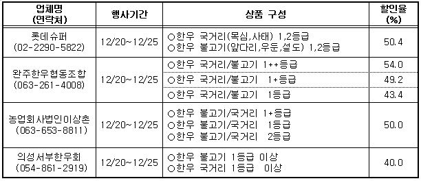 오는 12월 20일(수)부터 12월 25일(월)까지 송년맞이 한우 할인판매 행사가 진행되오니