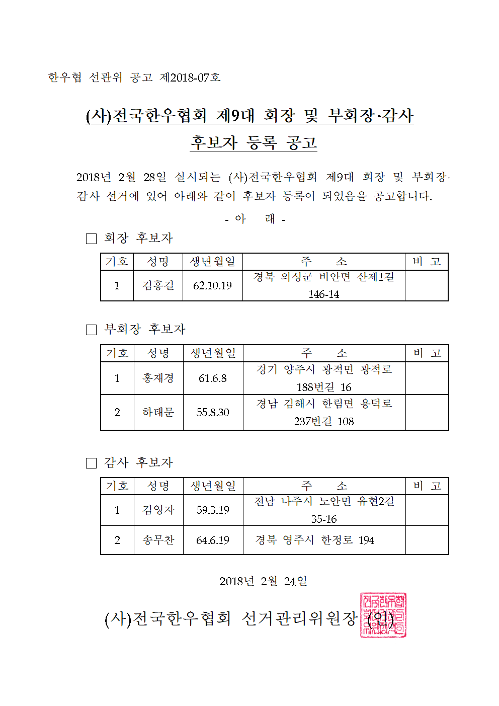 [공고] (사)전국한우협회 부회장선거 후보 추가 등록기간 공고