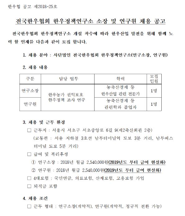 전국한우협회 한우정책연구소 소장 및 연구원 채용 공고