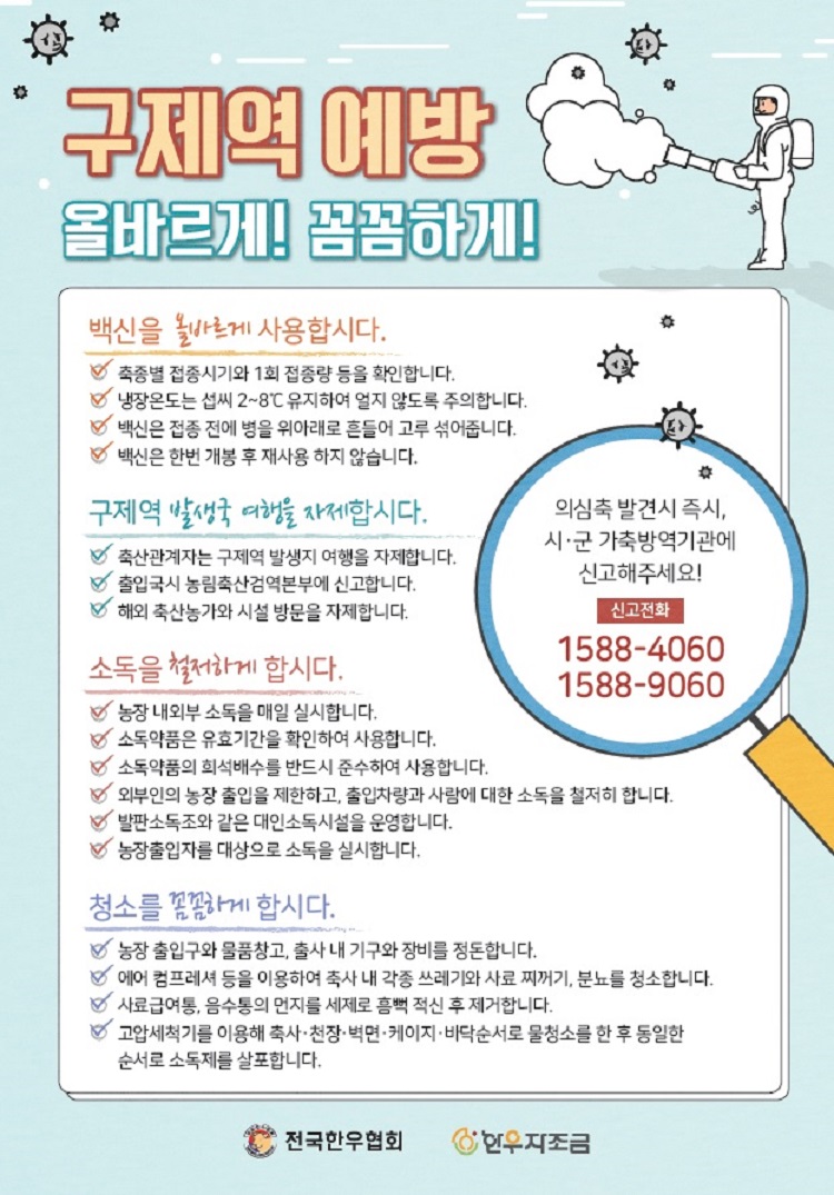 2. 이와 관련하여 우리한우 농가는 아래와 같이 전국의 축산 농가의 구제역 전국 긴급백신접종과 일제 소독 등에 우리가 적극 참여가 있을 때만이 소기의 성과를 이룰 수 있다고 봅니다.