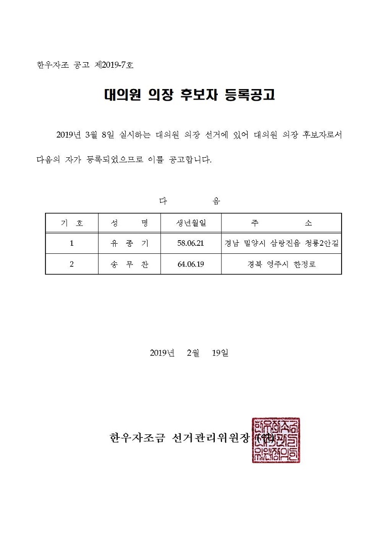 [공고] 제4기 후반기 한우자조금 대의원 의장 후보자 등록공고